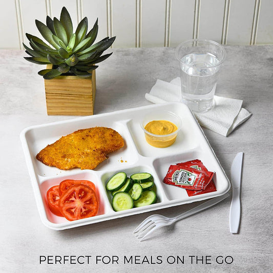 Heavy Duty Compartment Plates | 10 Inch Disposable 3 Compartment Divided Plates For Adults & Kids | White Eco Friendly Sugarcane Paper Plates Are Cut & Leak Resistant | 125 Pack